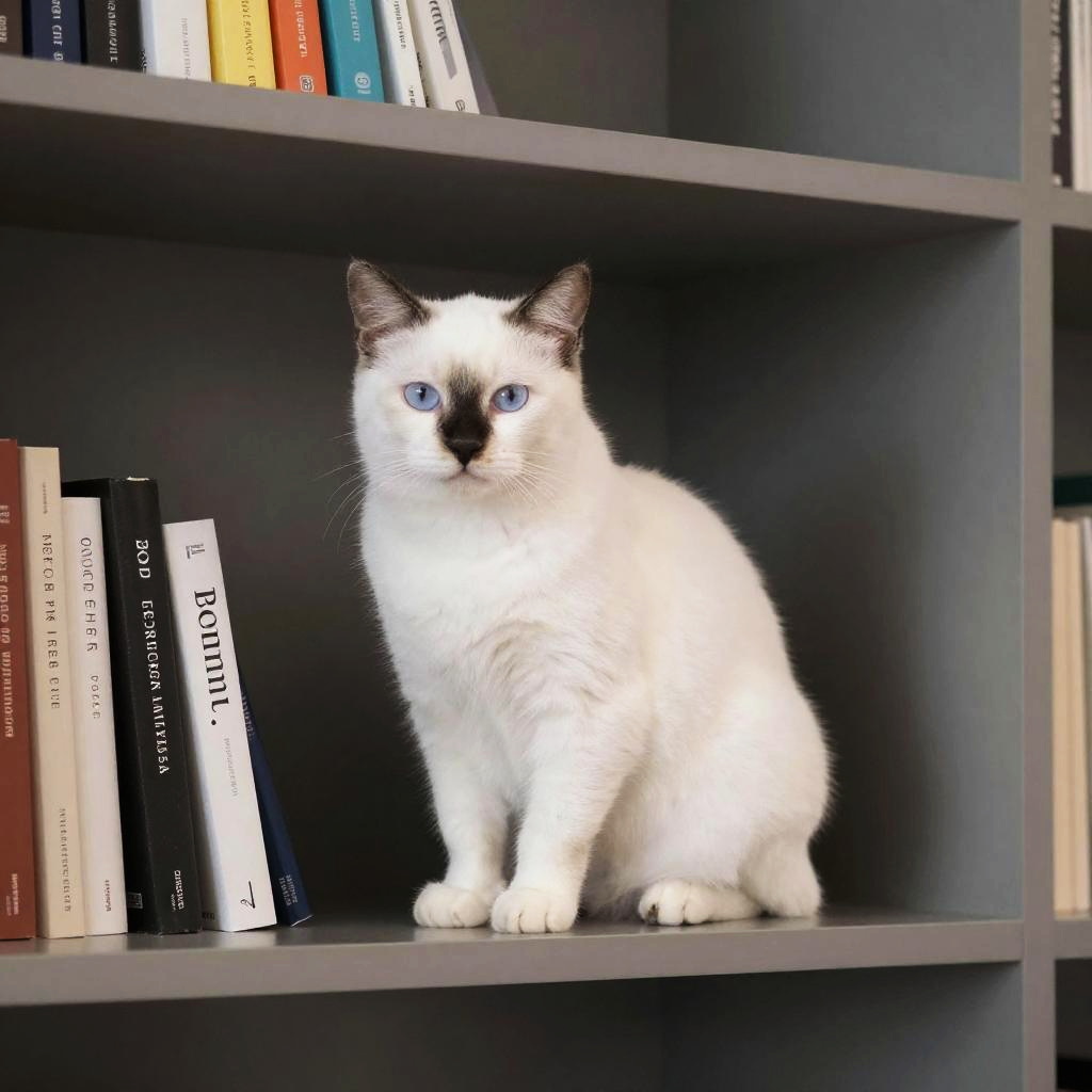 A white cat with a distinctive black nose and striking blue eyes sits elegantly on a minimalist modern bookshelf. The cat's fur is soft and detailed, complementing the sleek contemporary interior design. The scene is lit with soft ambient light, enhancing the calm and refined aesthetic.