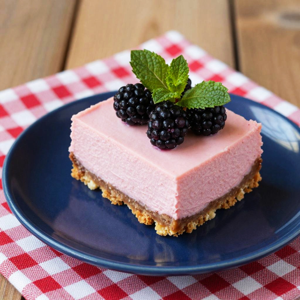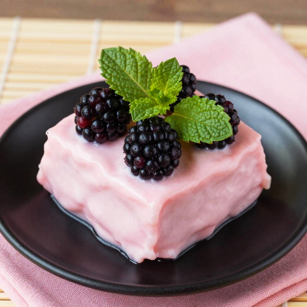 A close-up photo of a square piece of creamy pink dessert topped with juicy blackberries and a fresh green mint leaf, all on a shiny black plate. The background features a bamboo mat with a pink cloth underneath the plate, adding a cozy, rustic feel. The colors are vibrant and the textures look deliciously rich and fresh.