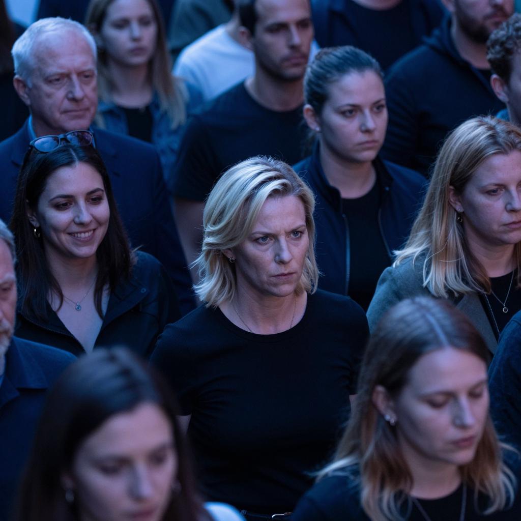 Photograph of a courtroom scene. A serious-looking middle-aged bald man in a gray suit and red tie sits with arms crossed, looking forward. A brunette woman in a black pinstripe suit with white collar and pearl necklace sits beside him, looking to the left. Two blurred men in suits sit in the background. The courtroom has wooden benches and a patterned wall.