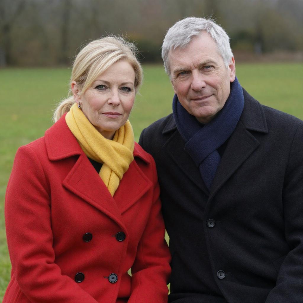 Photograph of two middle-aged men standing outdoors. The man on the left has short, gray hair, wears a brown coat, blue shirt, and patterned tie, looking serious. The man on the right, with balding hair, wears a black coat, gestures with his hands, smiling. Background includes a grassy field, blurred buildings, and a black dog.