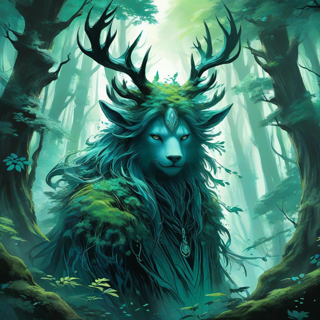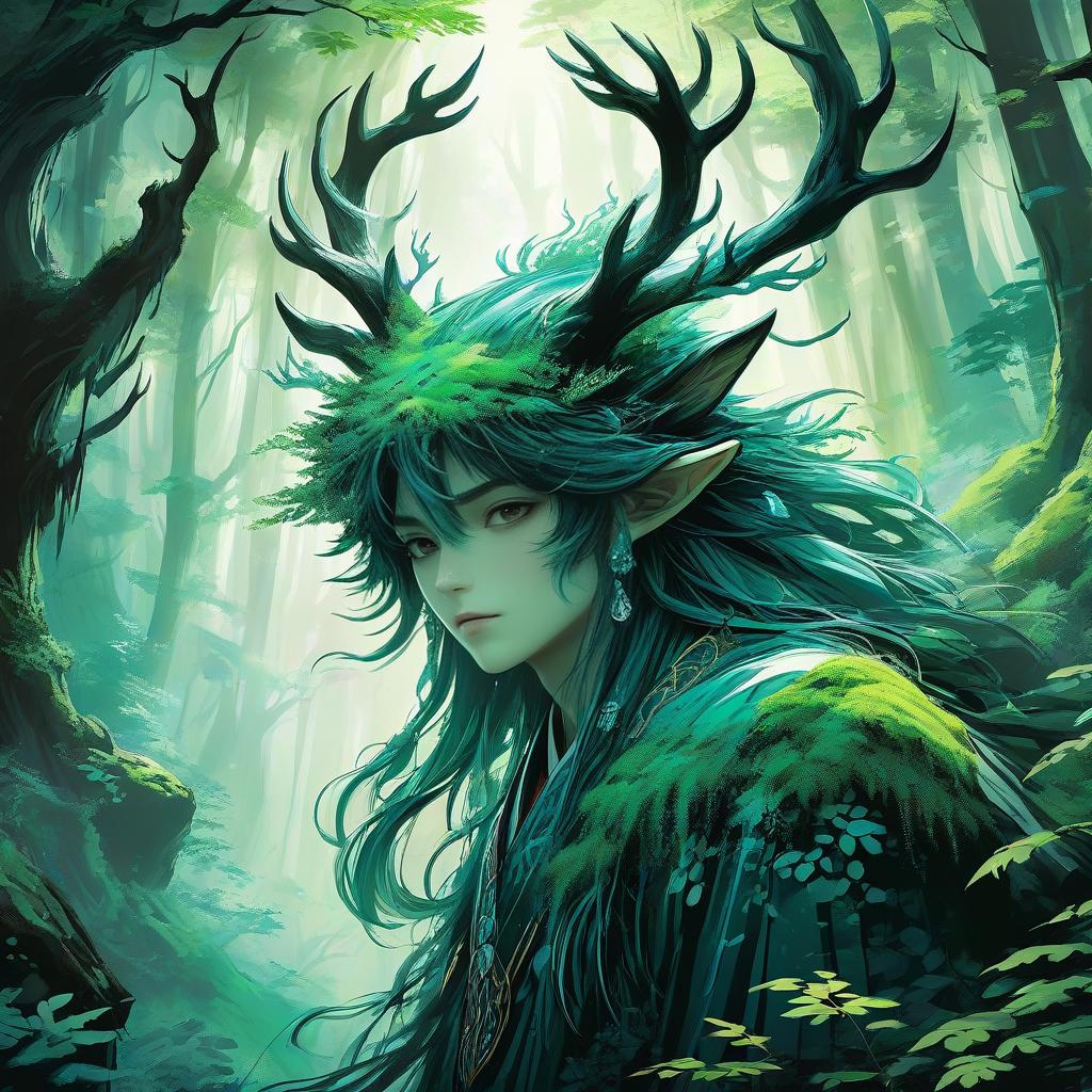 A highly detailed digital painting of a mystical forest spirit in a vibrant green forest. The figure has long flowing green hair, pale skin, and wears an intricately designed green robe with glowing patterns. Large black antlers adorn the spirit’s head, enhancing its ethereal and magical presence. The background features towering trees and soft, luminous light filtering through the foliage, creating an enchanting woodland atmosphere.