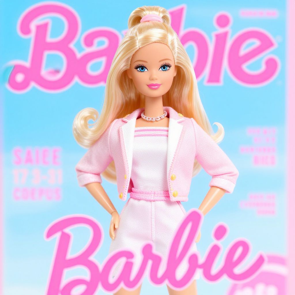 Digital image of blonde Barbie doll with blue eyes, wearing a white jacket and pants, against a bright blue background with "Barbie" in pink,
