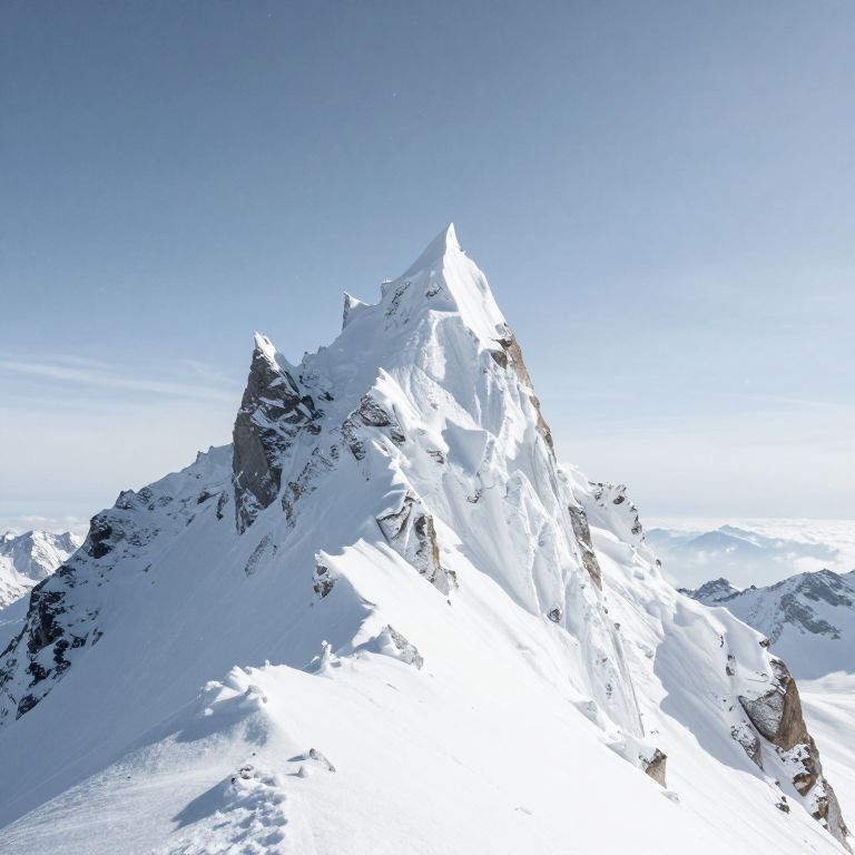 A jagged, crystalline mountain peak emerges from a pristine snowscape, its spiky formations defying gravity and natural erosion, as delicate snowflakes drift lazily against a serene, starlit sky.