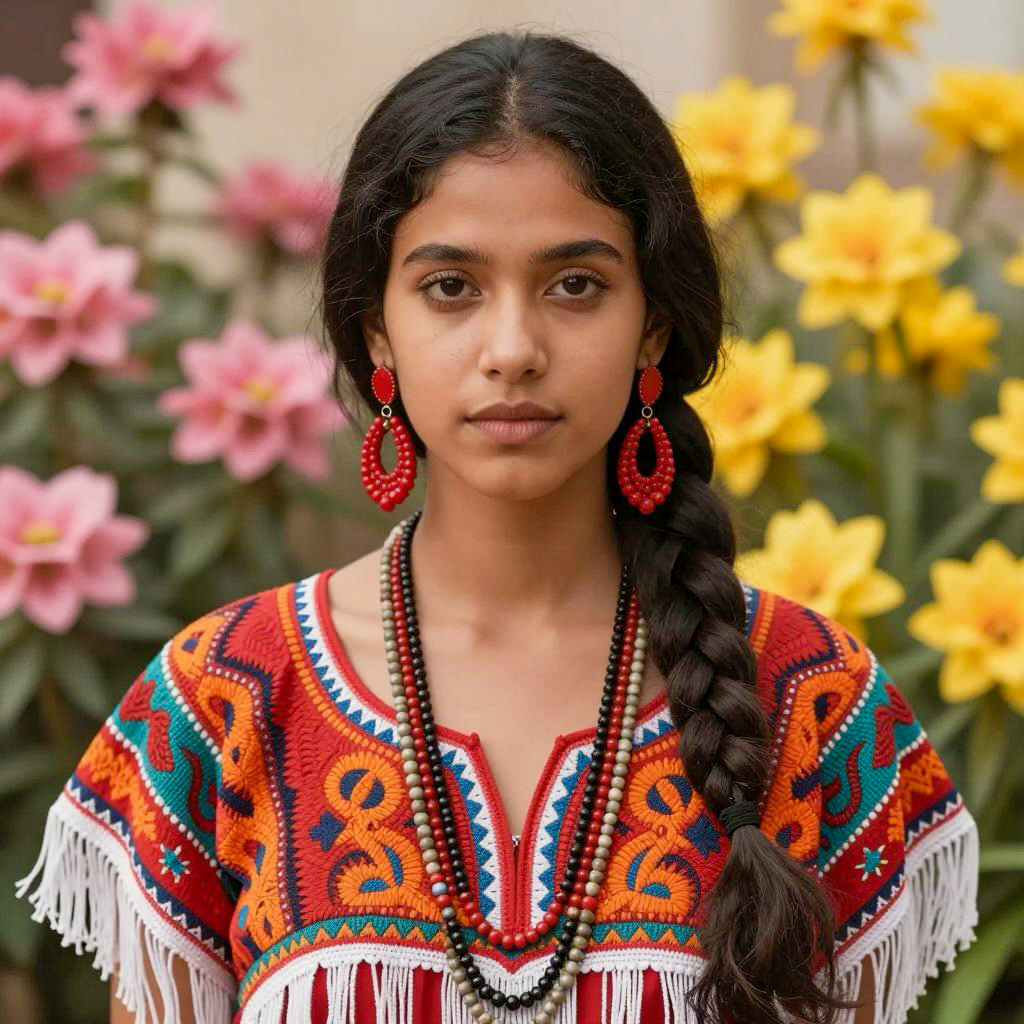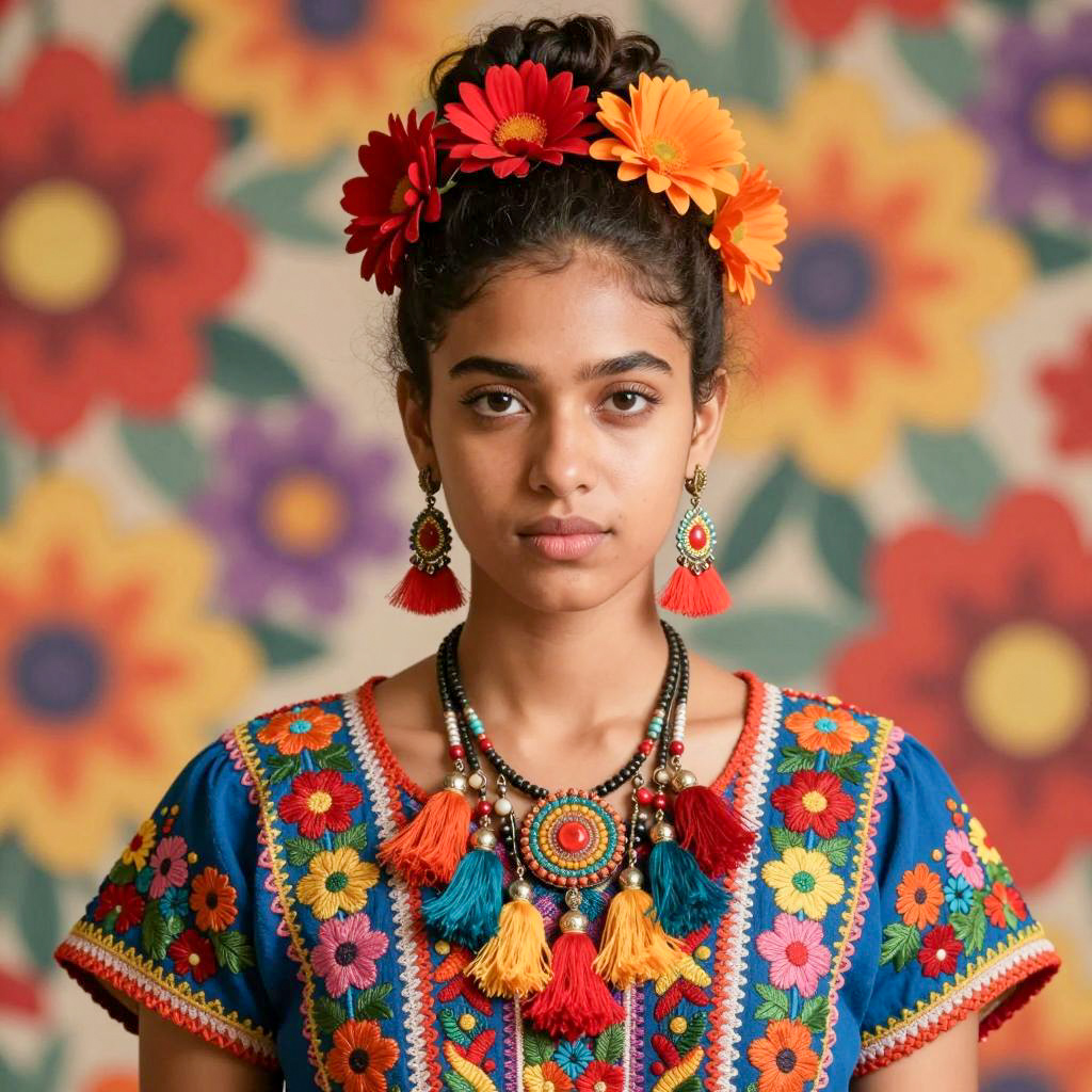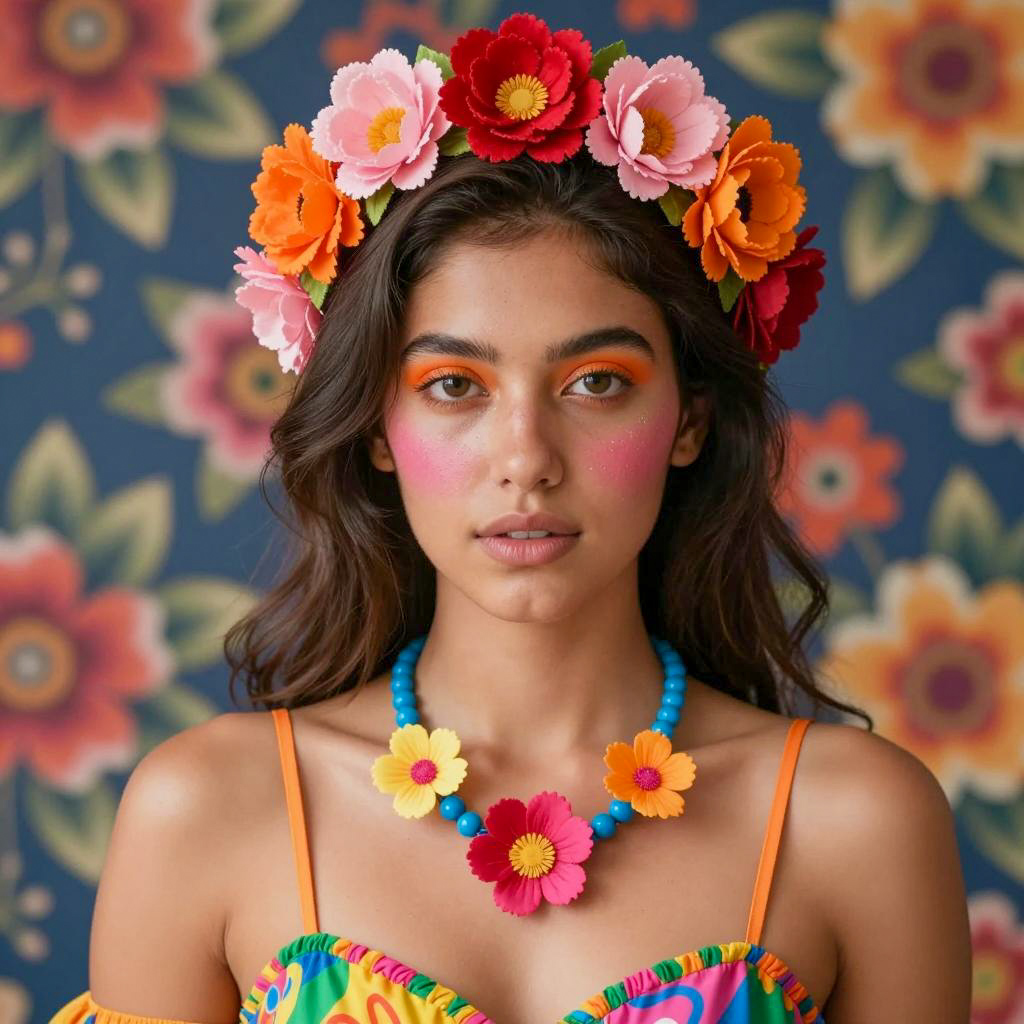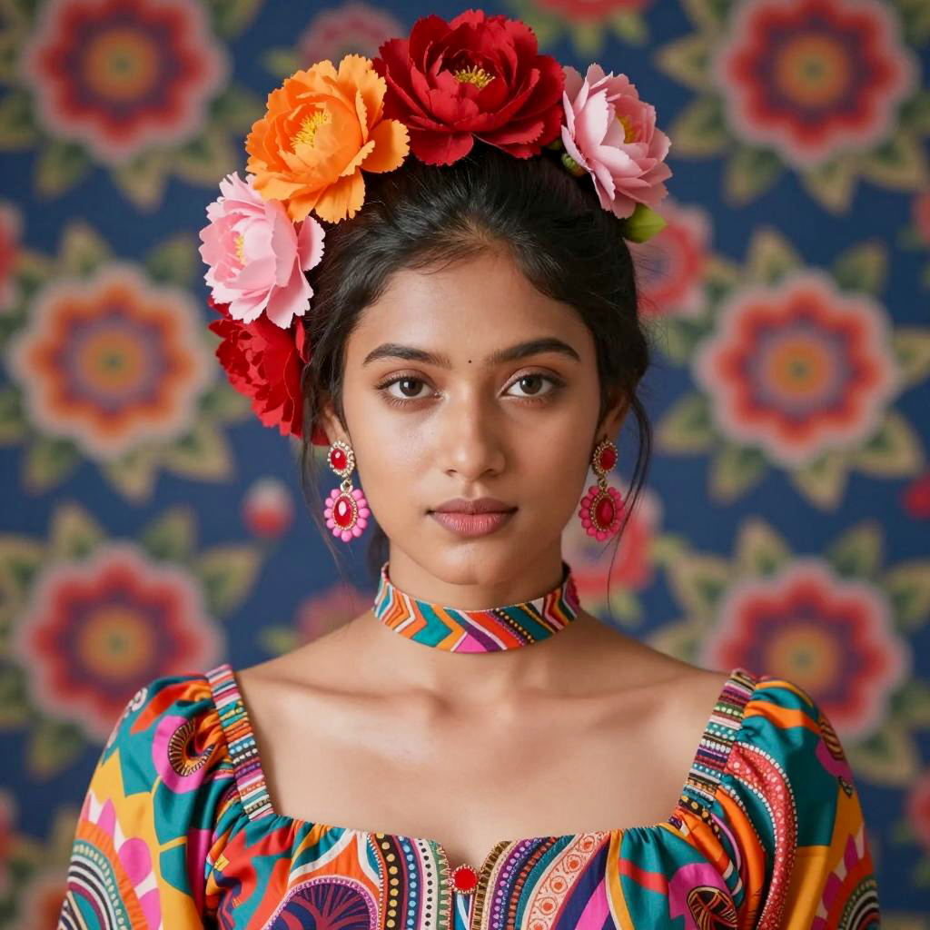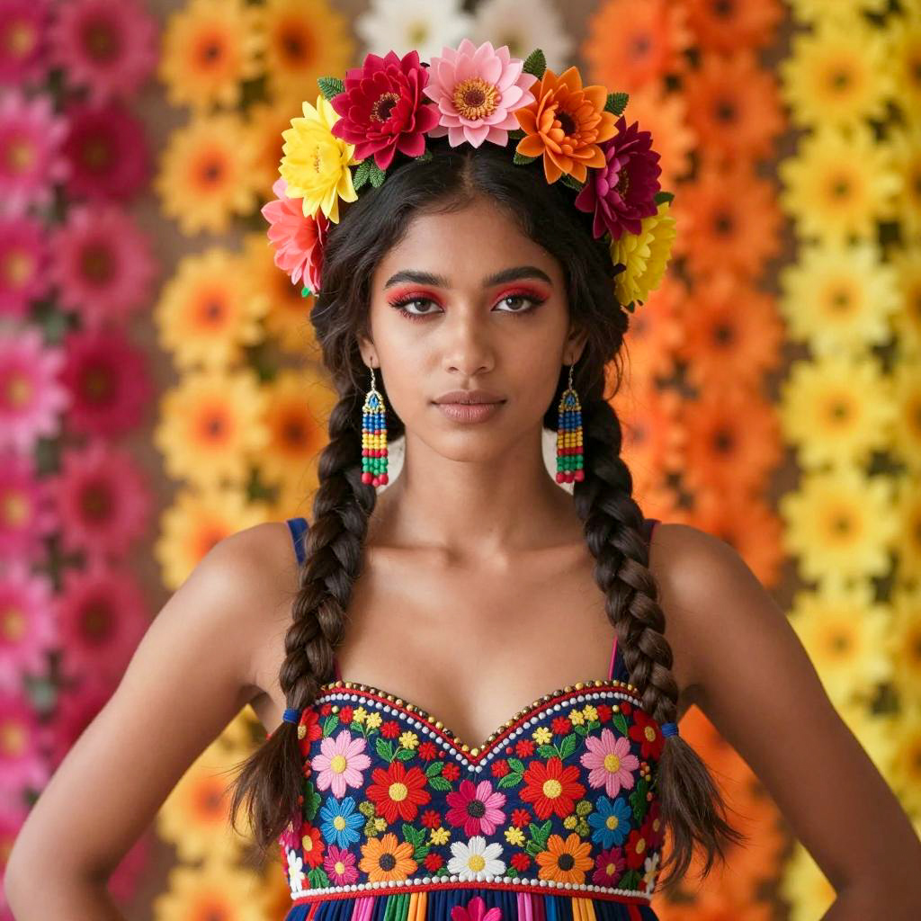 Photograph of a young woman with medium brown skin and dark hair in braids, wearing a colorful floral headdress and matching embroidered dress. Vibrant pink, orange, and yellow flowers fill the background. She has red eyeshadow and neutral lips. Her earrings are long, multicolored beaded. She stands facing forward, arms at her sides.