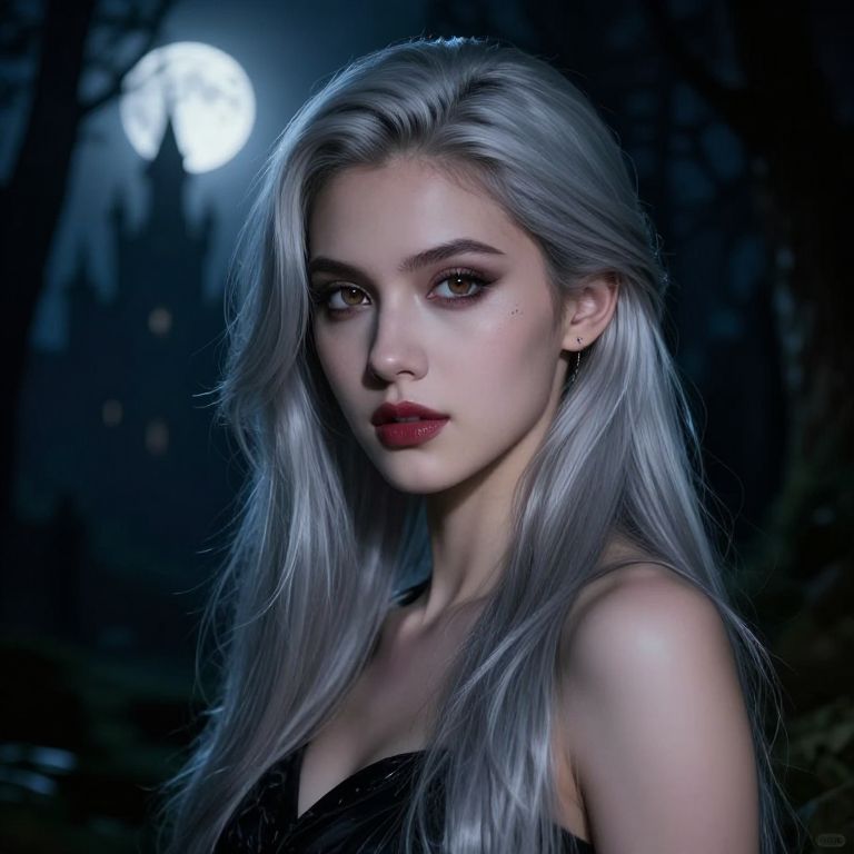 Digital portrait of a pale-skinned woman with long, silver hair, dark red lipstick, and intense eyes, illuminated by a full moon in a dark