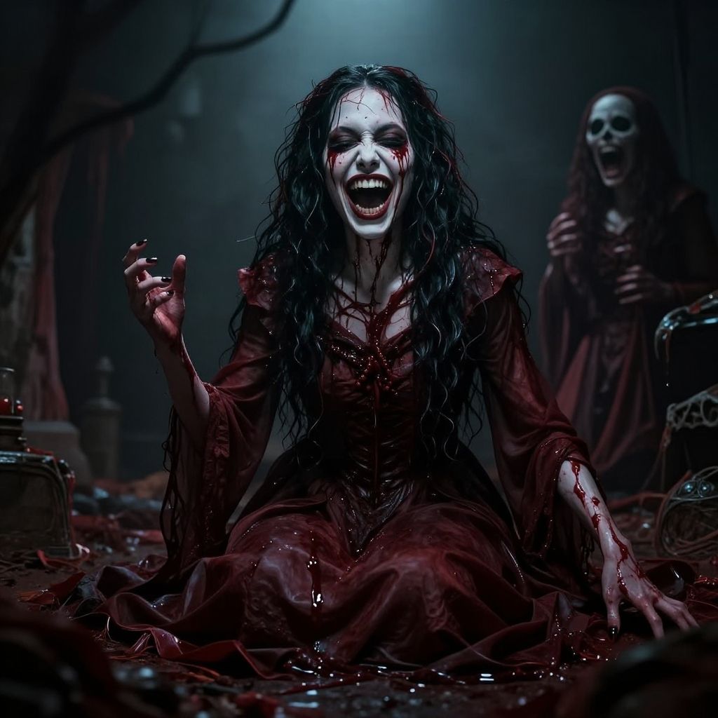 Photorealistic CGI: Pale woman with long black hair, blood-stained red dress, screaming, blood on hands, sitting on dark, blood-so