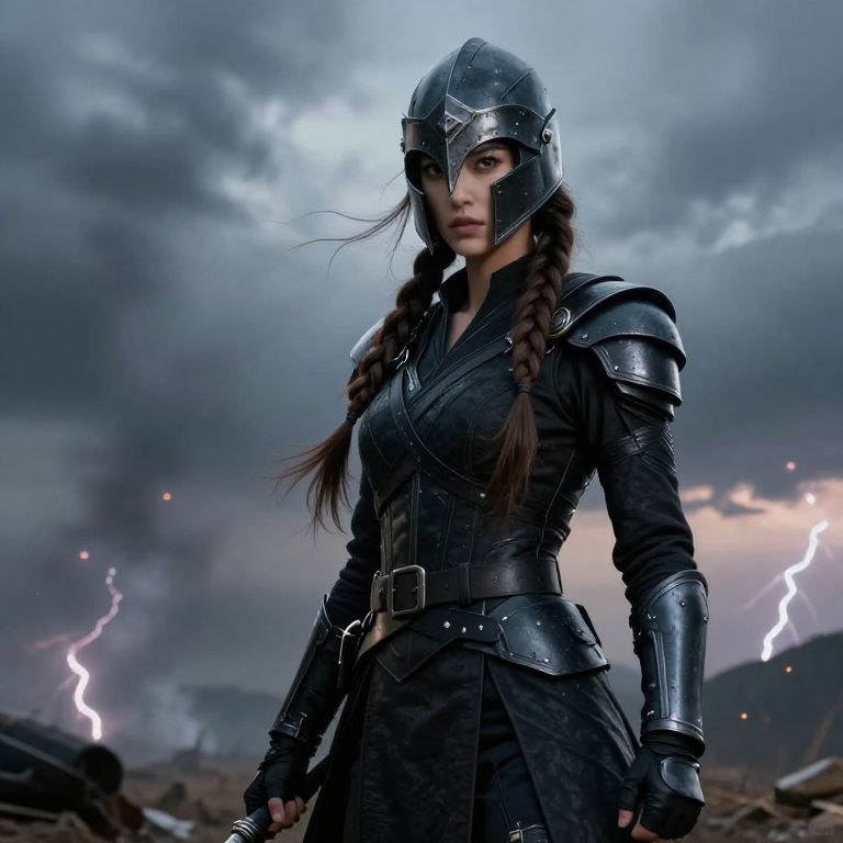 A fierce female warrior stands confidently, wearing a sleek black outfit with a dark, armored texture, complete with a black belt and black gloves that add to her rugged, combat-ready appearance. She dons a heavy, stylized helmet with a jagged edge, covering her face and giving her a mysterious, intense aura. Her long brown braids cascade down her back, flowing slightly in the wind, emphasizing her strength and grace. Her eyes are sharp and determined, reflecting both courage and wisdom. The setting is a stormy battlefield at dusk, with rising smoke and faint lightning, enhancing the epic and powerful atmosphere of her presence.