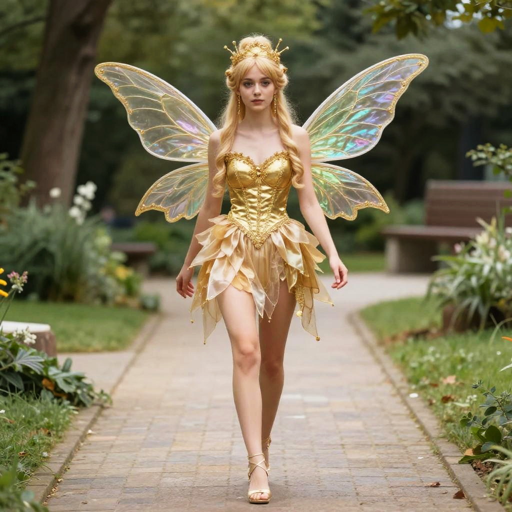 Photograph of a fair-skinned, blonde woman with an updo hairstyle, walking down a sunlit pathway in a park. She wears a gold, strapless fairy costume with a leafy skirt and matching gold sandals. She has transparent, iridescent wings extending from her back. The background features blurred green grass, trees, and a brick building with black lampposts. The woman's expression is neutral, and the overall scene has a magical, whimsical feel. The image has a slight CGI effect, enhancing the brightness and clarity of the fairy wings and costume.