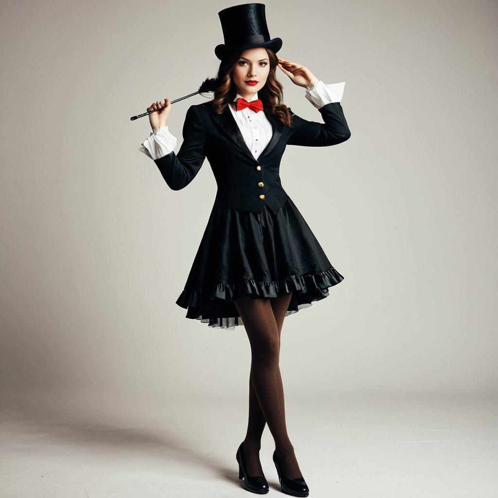 Full body portrait of a young woman in a classic ringmaster costume featuring a black tailored jacket with gold buttons, a flared black skirt with ruffled hem, black tights, and black high heels. She wears a white shirt with prominent cuffs, a red bow tie, and a tall black top hat. The woman has brown hair styled in loose waves and red lips, holding a black riding crop over her shoulder while looking confidently at the viewer.