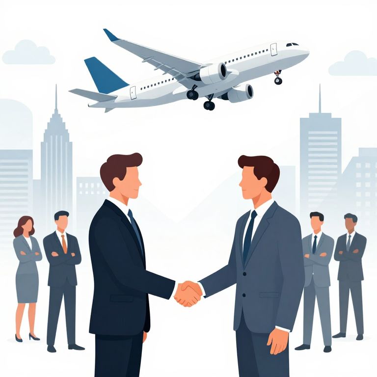 A digital illustration depicts two business figures shaking hands amidst a crowd of formally dressed individuals, symbolizing trust-building in a corporate setting, with a sleek airplane soaring above against a backdrop of stylized skyscrapers and soft clouds, evoking themes of ambition and collaboration.