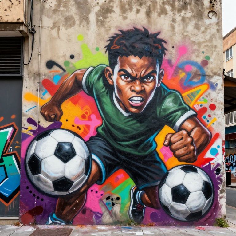 Vivid graffiti mural of an intense young black boy in green soccer uniform, crouching, fists clenched, surrounded by colorful splatters, with