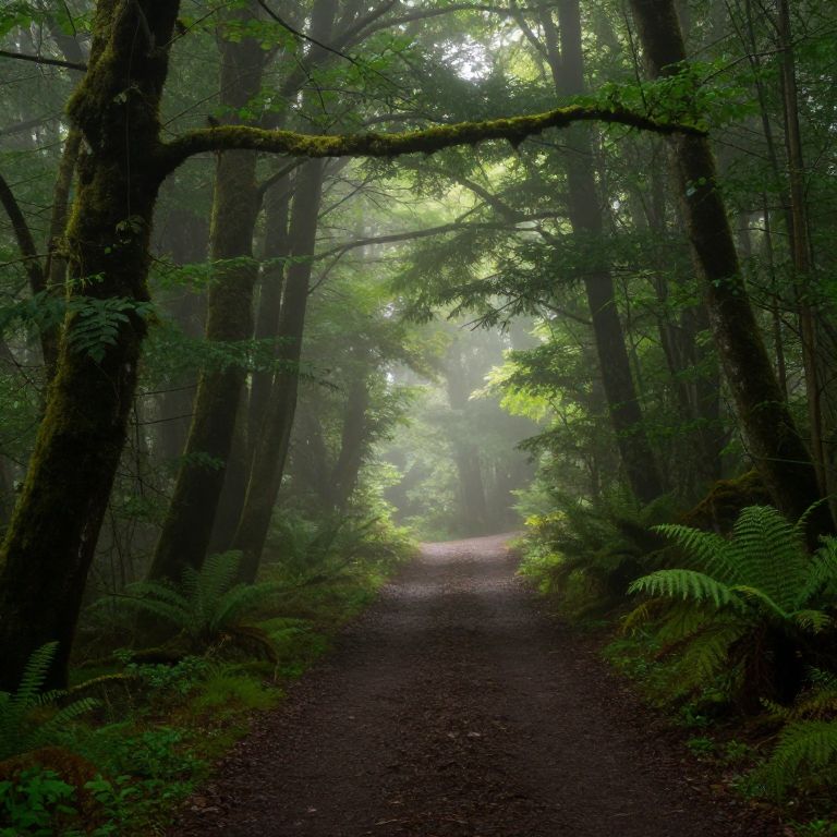 Photograph of a misty forest path, surrounded by tall trees, vibrant green ferns, and moss-covered branches, with sunlight filtering through the dense