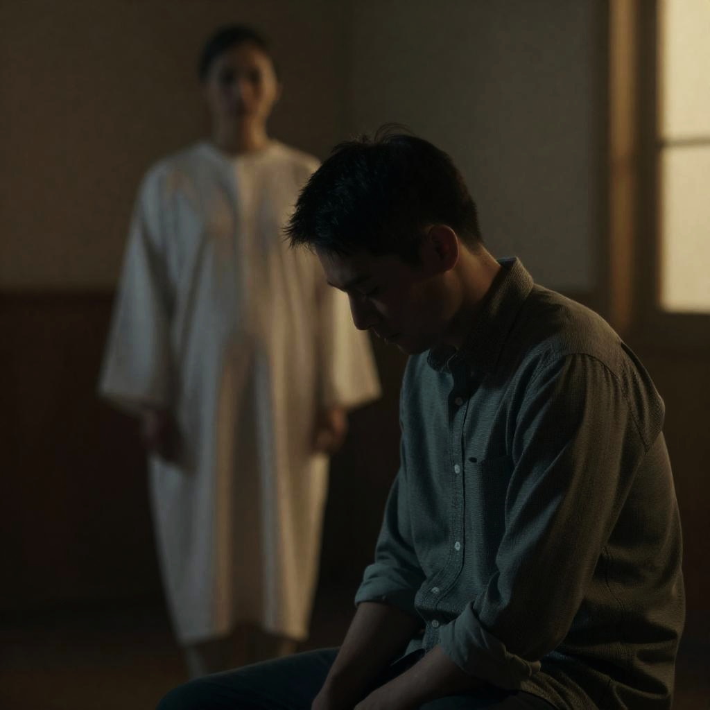 Darkly lit room, man with short, dark hair, green checkered shirt, sitting in foreground, head bowed, shadowed, another person in white robe, blurry, standing in background, yellow-lit window to the right, wooden panel wall.