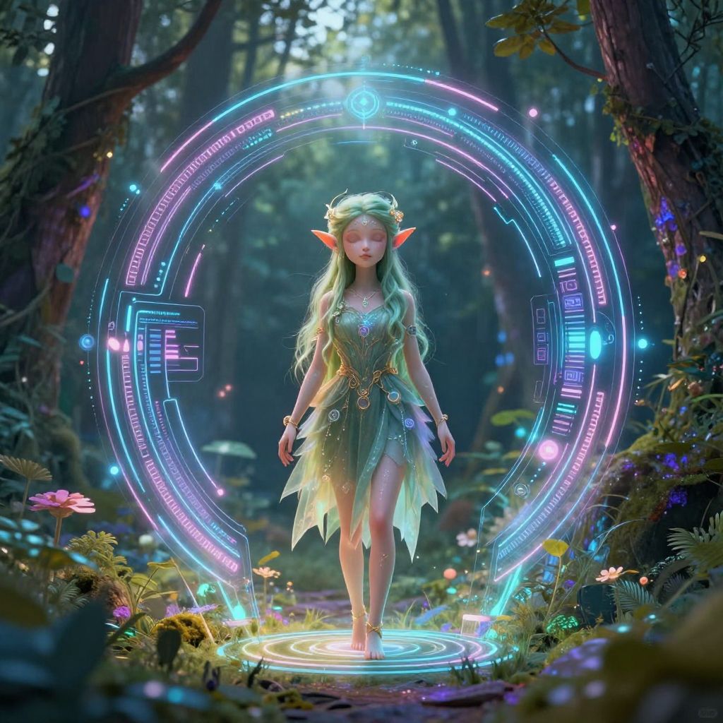 Digital artwork of a glowing, ethereal elf with long, blonde hair, green eyes, and pointed ears, standing in a magical forest illuminated by fairy