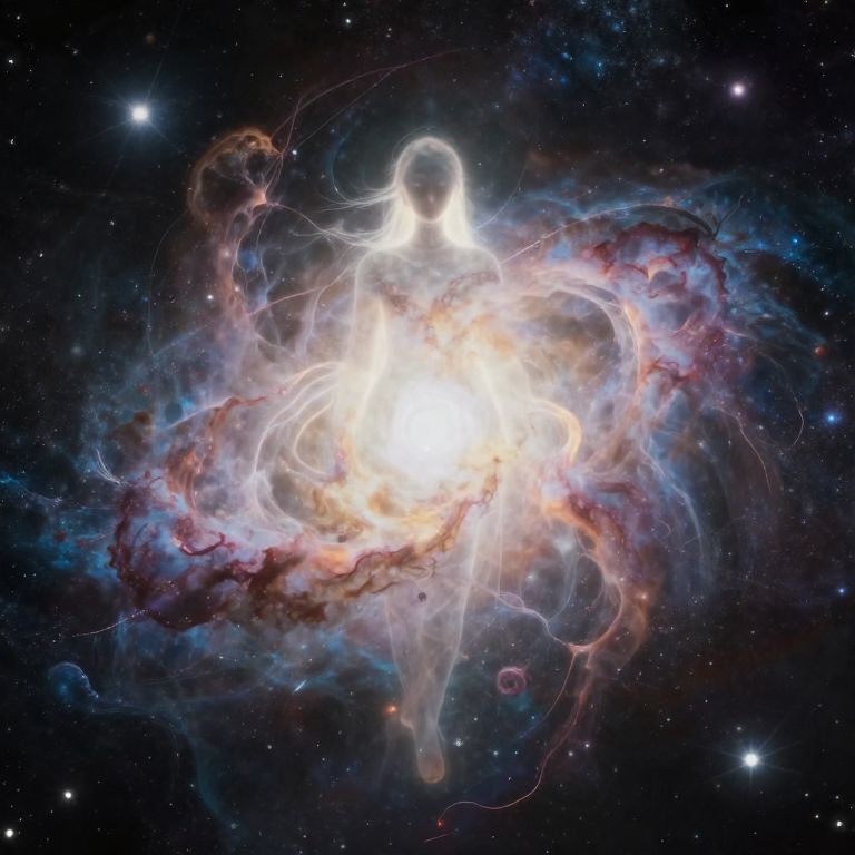 Photograph of a glowing, ethereal white figure surrounded by vibrant nebulae in space, with colorful gas clouds and stars in the background. Cosmic