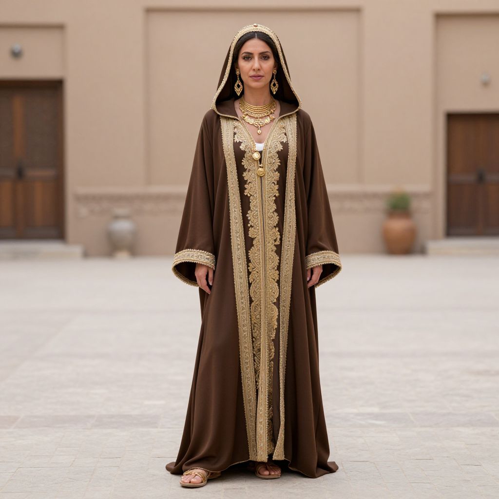 Photograph of a South Asian woman in a brown, gold-embellished traditional robe (kurtah) with a hood, standing in a