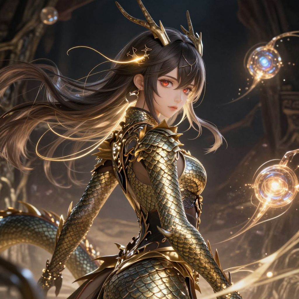 Anime girl hybrid with dragon scales on arms and shoulders, elegant flowing hair with glowing strands, surrounded by floating elemental orbs in a fantasy realm, dramatic lighting and rich textures, highly detailed fantasy art
