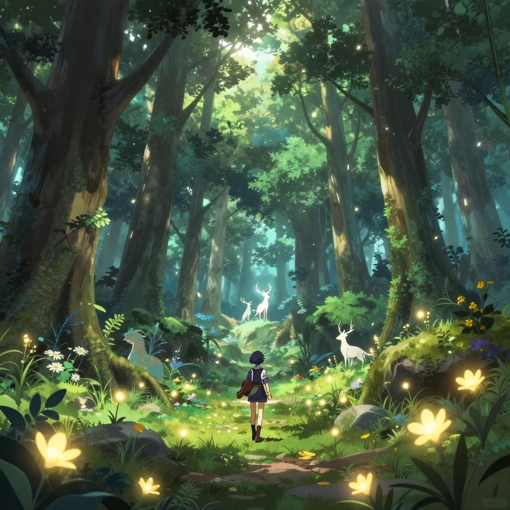 Miyazaki wallpaper portraying a magical night forest illuminated by glowing fireflies, ancient trees, and mysterious spirits, using deep blues and vibrant greens to create an enchanting and immersive atmosphere filled with wonder.
