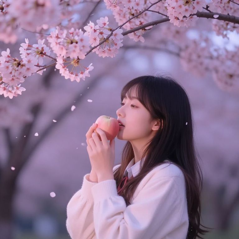 Girl is eating apple under a blooming cherry tree, petals falling around, serene expression, twilight atmosphere with soft pink and purple hues, whimsical and dreamy scene