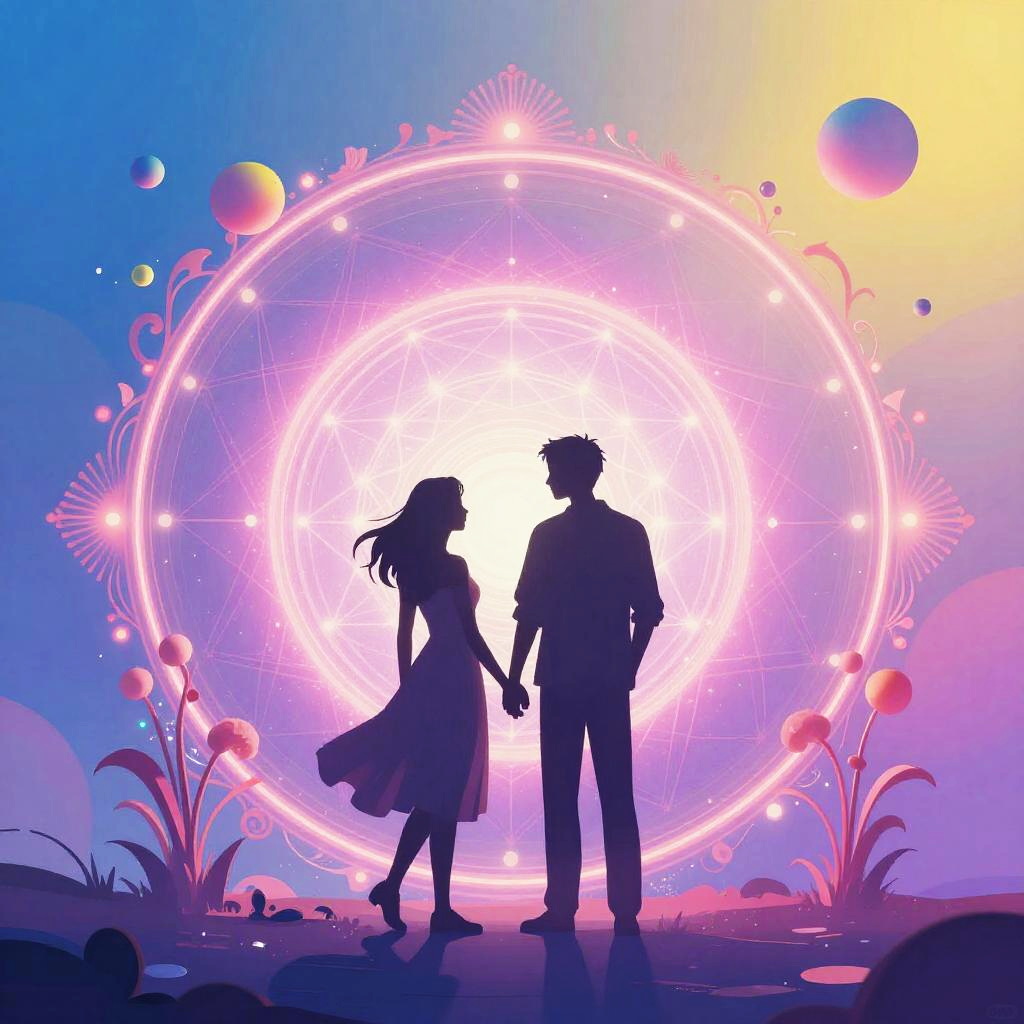 This vibrant digital artwork features a couple standing hand-in-hand at the center, silhouetted against a glowing, circular, pink and purple geometric pattern. Surrounding them are floating, colorful spheres and intricate, pink floral-like structures. The background transitions from deep blue on the left to bright yellow on the right, creating a whimsical, almost magical atmosphere. The overall style is futuristic and dreamy.