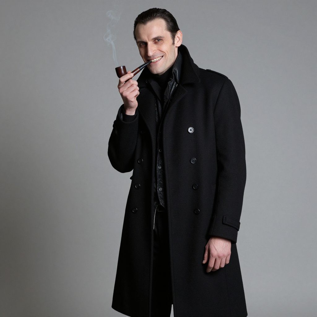 Photograph of a smiling, fair-skinned man with slicked-back dark hair, wearing a black overcoat, holding a smoking pipe, against a