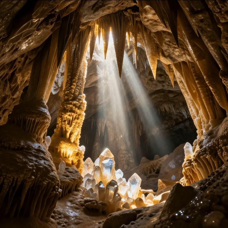 A cavernous realm bathed in ethereal light, where sunbeams cascade like liquid gold, illuminating crystalline stalactites that shimmer with otherworldly luminescence.