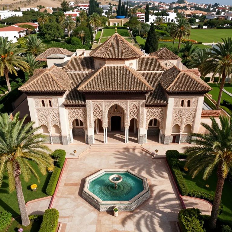 A magnificent, photorealistic Moorish mansion with intricate architectural details, surrounded by a lush landscape of palm trees and a central fountain, captured from an aerial perspective.