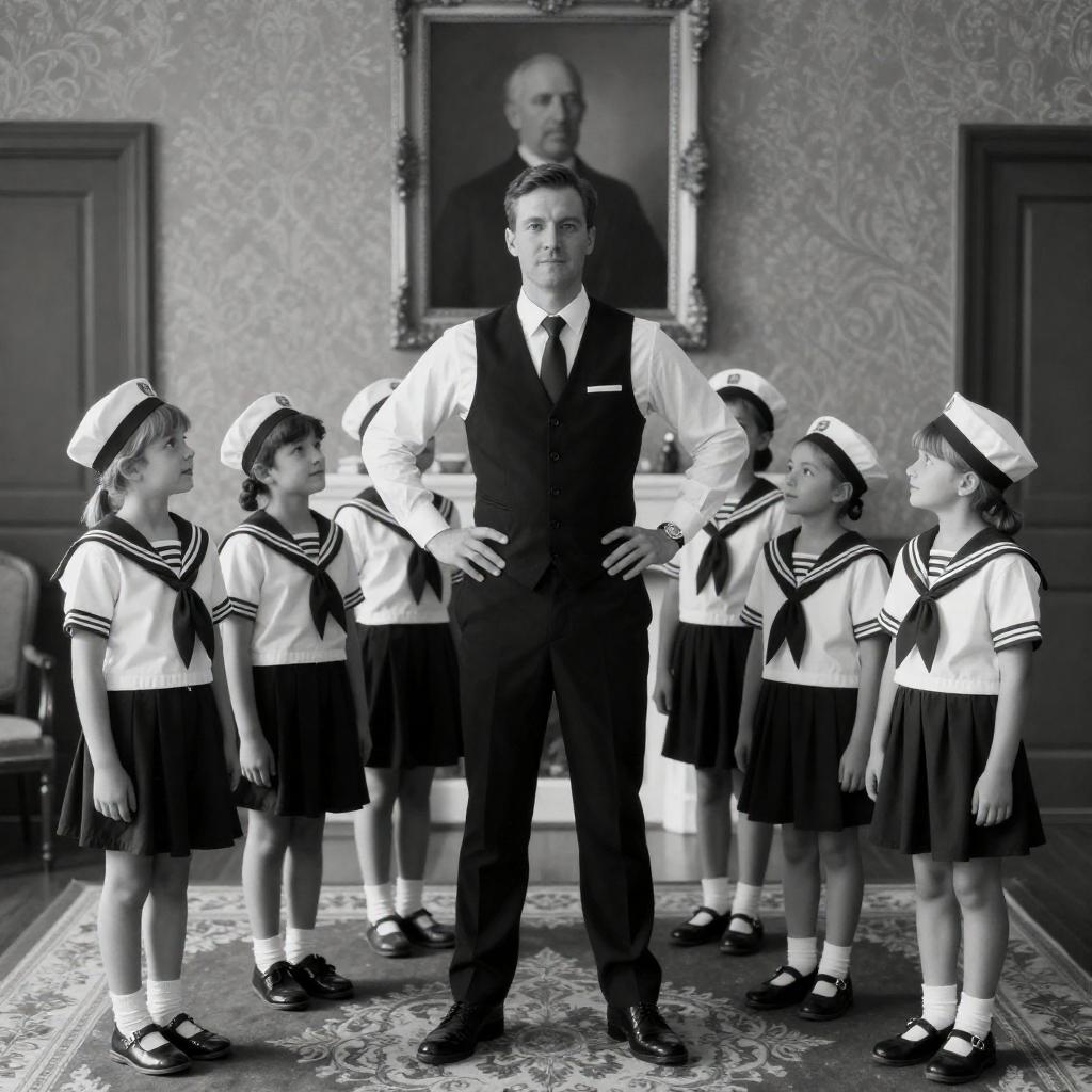 Black-and-white photograph of a man in a white shirt and black vest standing confidently in the center, surrounded by six children in sailor uniforms and hats. They stand in a formal room with ornate wallpaper, a framed portrait, and a patterned rug. The children look up at the man, who has his hands on his hips.