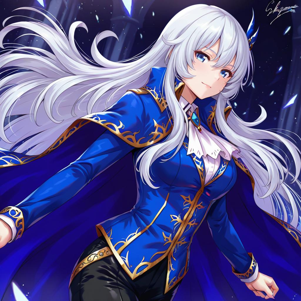 Argalia (project moon), project moon, 1boy, blue eyes, very long hair, white hair, sidelocks, hair ornament, blue cape, blue jacket, collared cape, black pants, long sleeves, gold trim, white ascot, by artist sakiyamama, illustrious