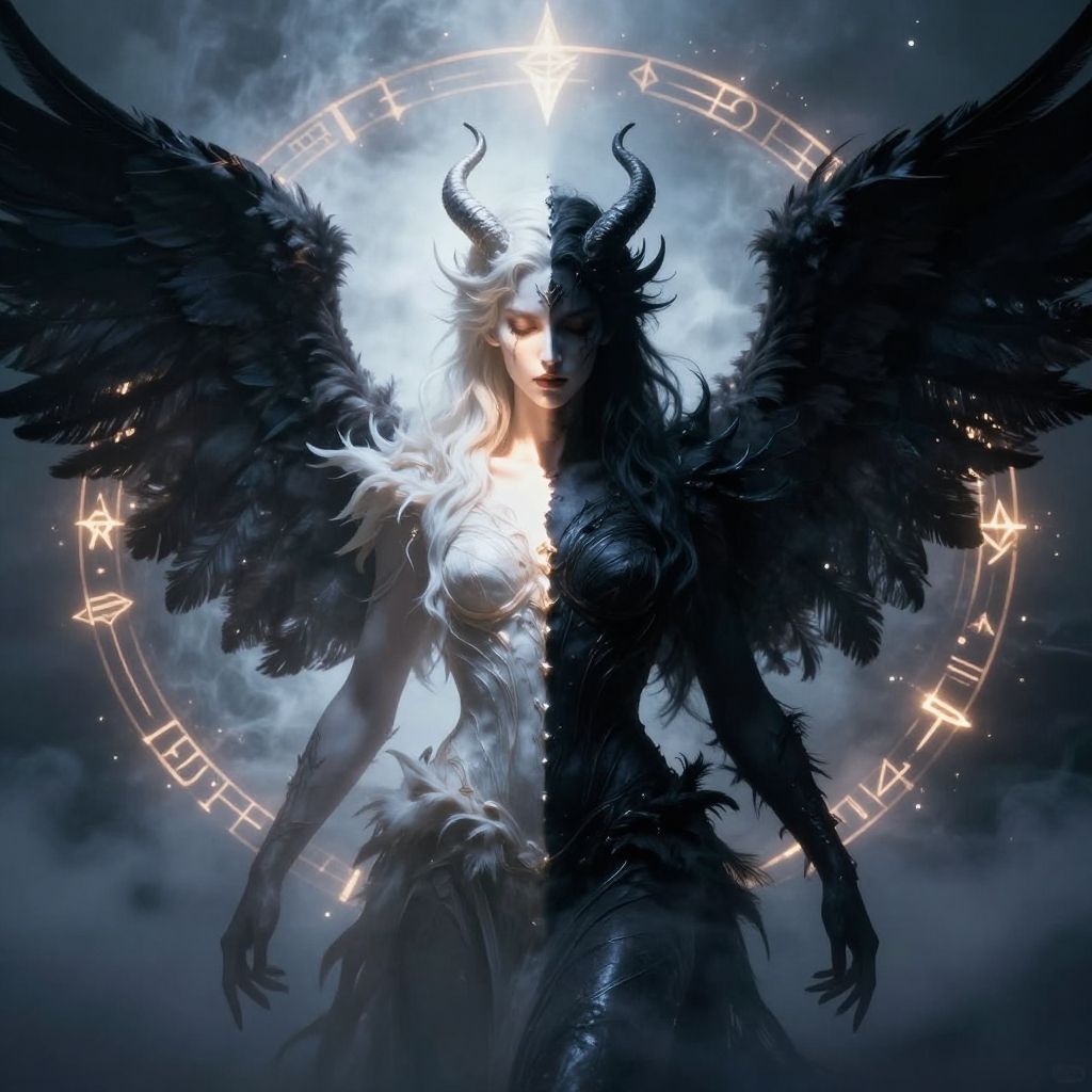 Half angel half demon with split face reflecting light and darkness, majestic wings blending feathers and smoke, surrounded by glowing runes and eerie mist, cinematic fantasy style