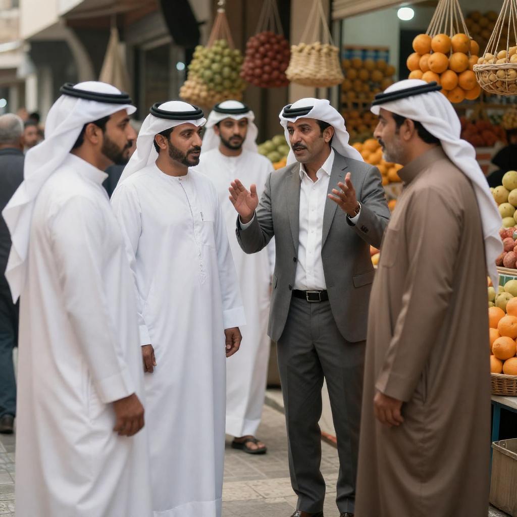 Photograph of a bustling Middle Eastern market scene. A group of men in traditional white robes and headscarves surround a man in a gray suit with a white shirt, gesturing animatedly. Another man in a brown robe and white headscarf stands to the right, near a basket of oranges. The background features market stalls with hanging produce.