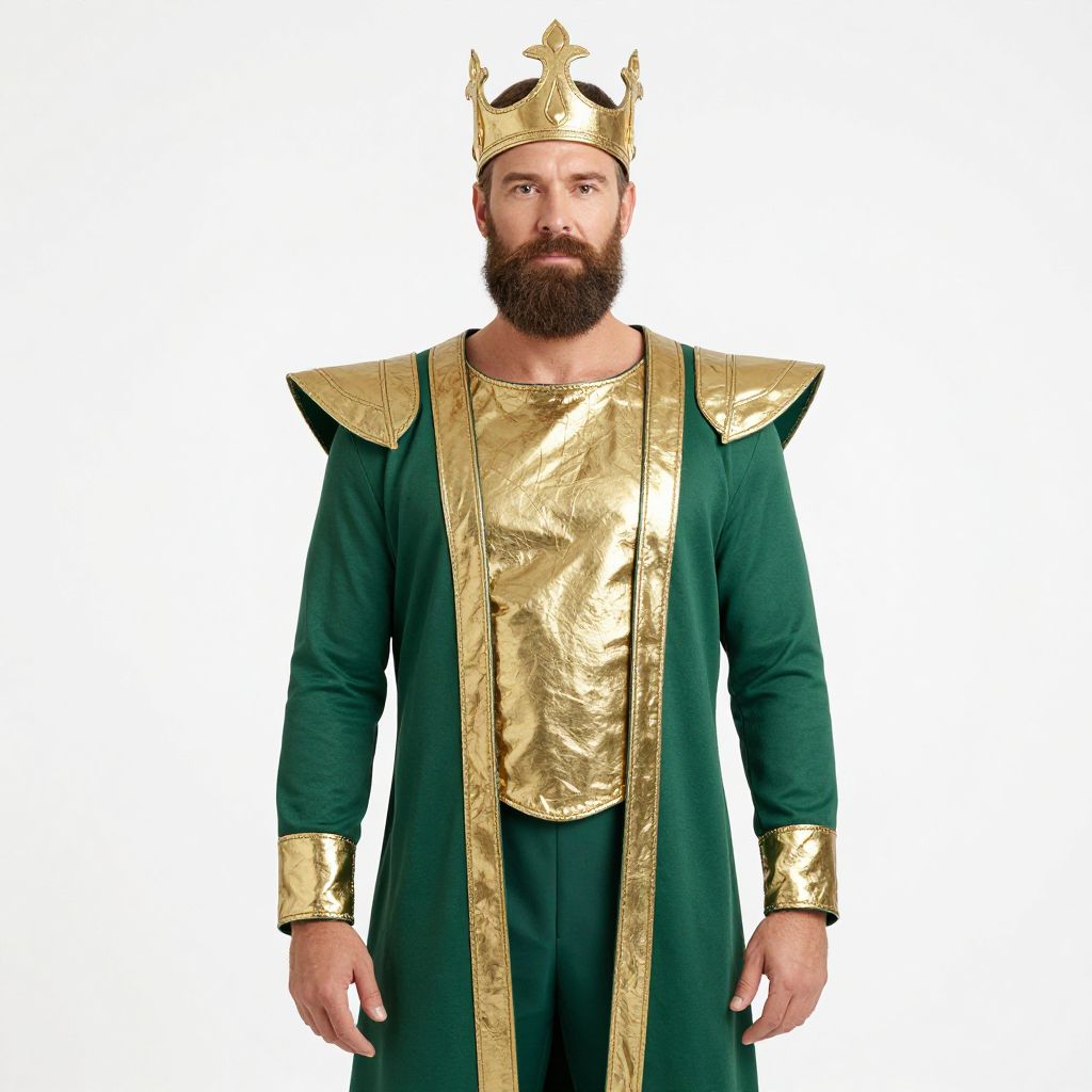 Photograph of a bearded man standing against a white background, dressed as a king. He wears a golden crown with pointed tips, a green robe with wide gold shoulder pads, and a gold chest plate. His long, dark green pants match the robe. The robe and pants are simple in design, contrasting with the shiny, textured gold of the crown, shoulder pads, and chest plate. The man has a serious expression, with his arms relaxed by his sides. The image is brightly lit, highlighting the metallic textures and rich colors of his regal attire.
