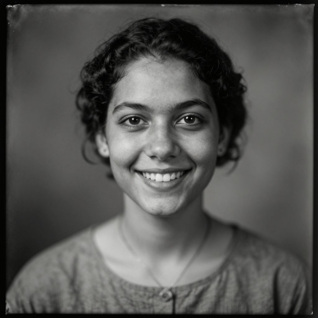 This is a black-and-white photograph of a young woman with curly, short dark hair and light skin. She is smiling broadly, showing her teeth, and has expressive, dark eyes. She is wearing a simple, buttoned, gray shirt. The background is a blurred gradient, drawing focus to her face. The photograph has a slightly vintage, grainy texture with soft edges and a subtle vignette effect, enhancing the portrait's intimate and warm feel. The lighting is even, highlighting her natural features and joyful expression.