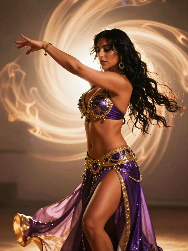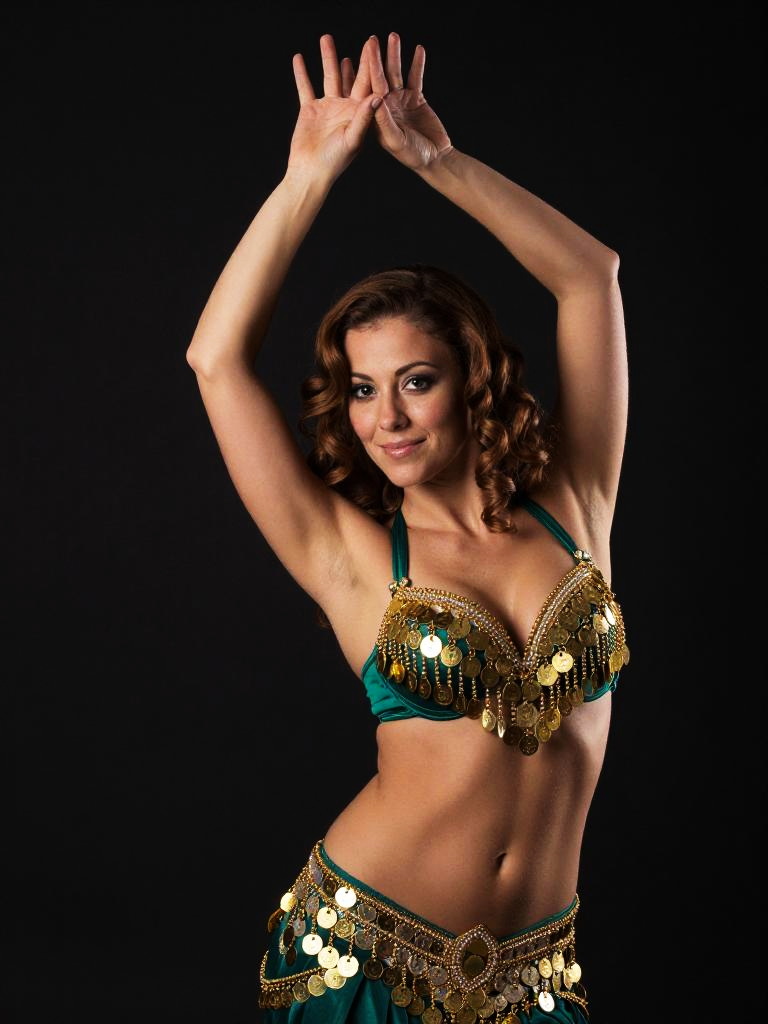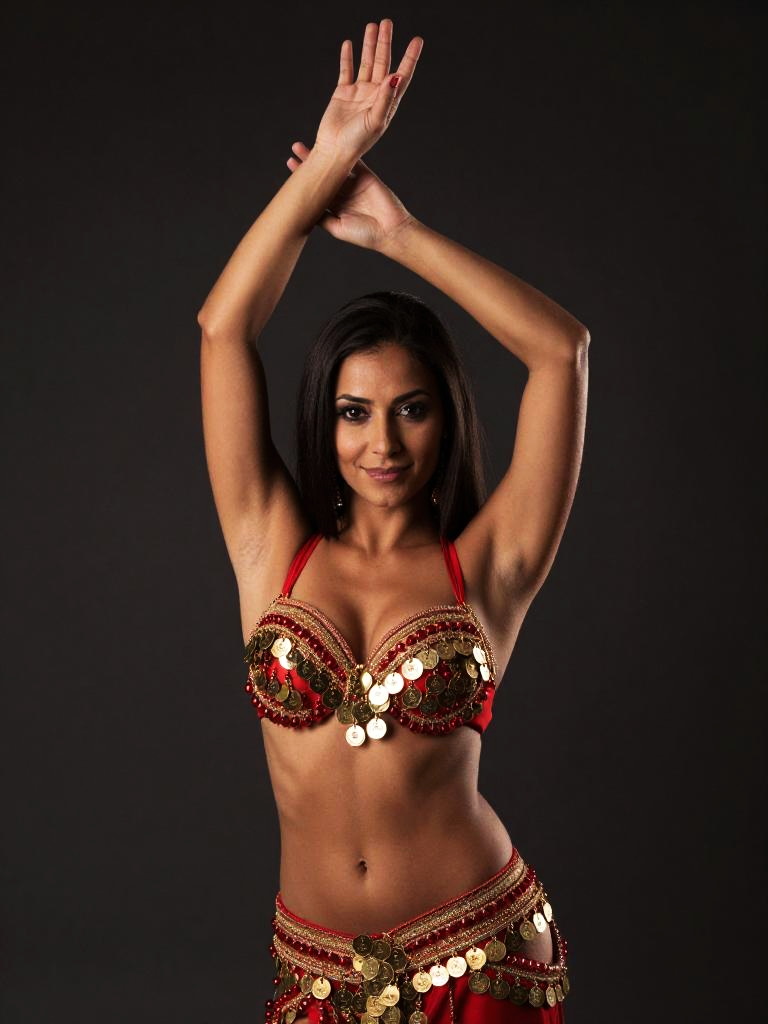 Belly dance, three-quarter portrait of light brown-skinned woman with straight dark hair and gentle features facing the camera, both arms raised gracefully above her head, head tilted slightly down with a soft smile, layered hip belt and gold and emerald bra top with dangling coins and sequins, simple dark background that makes the costume glow, minimal dark stage with faint rim light, dramatic yet elegant studio lighting, high-resolution dance photography
