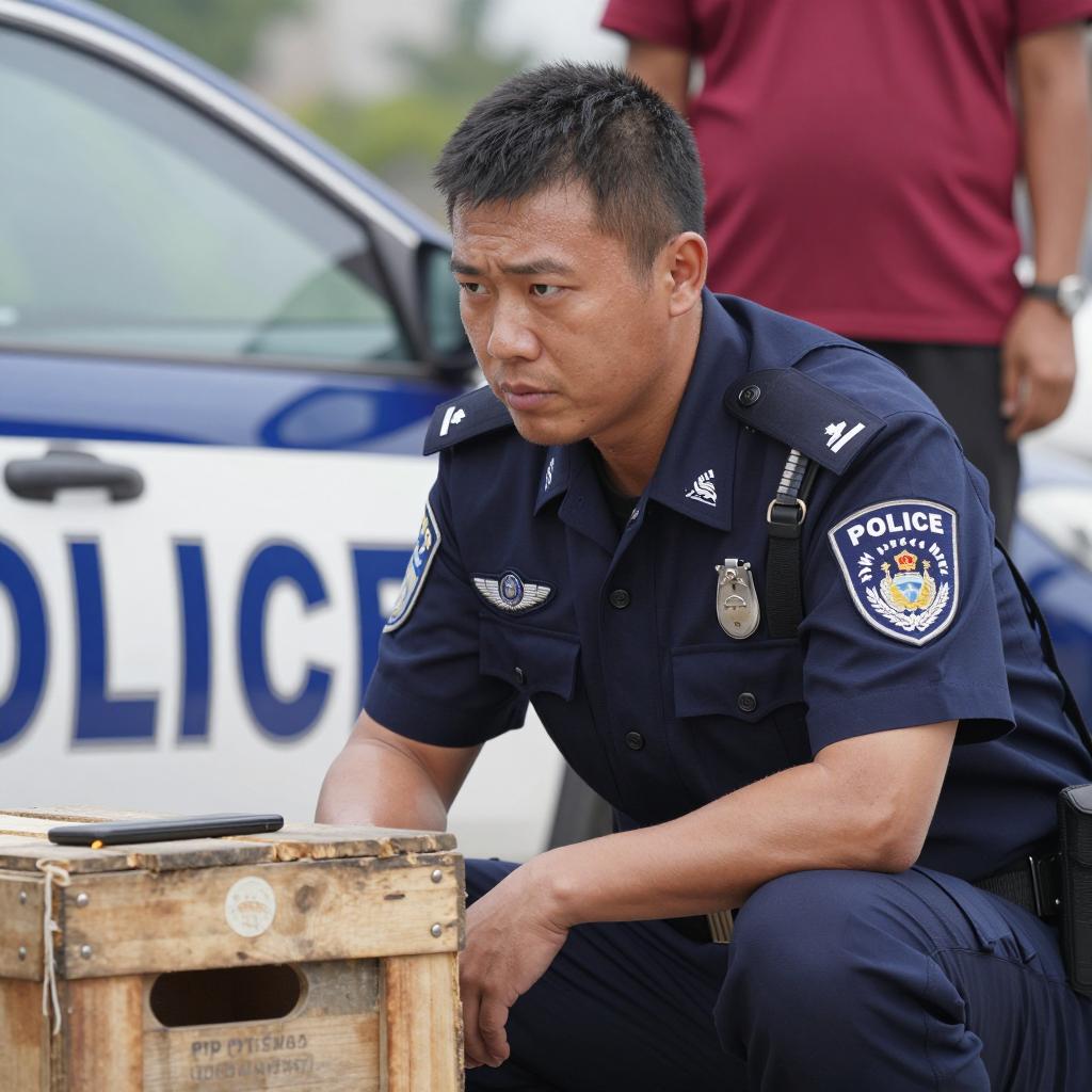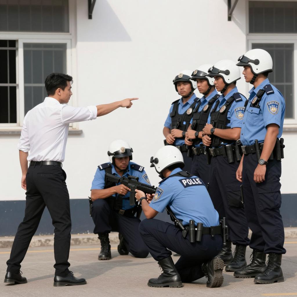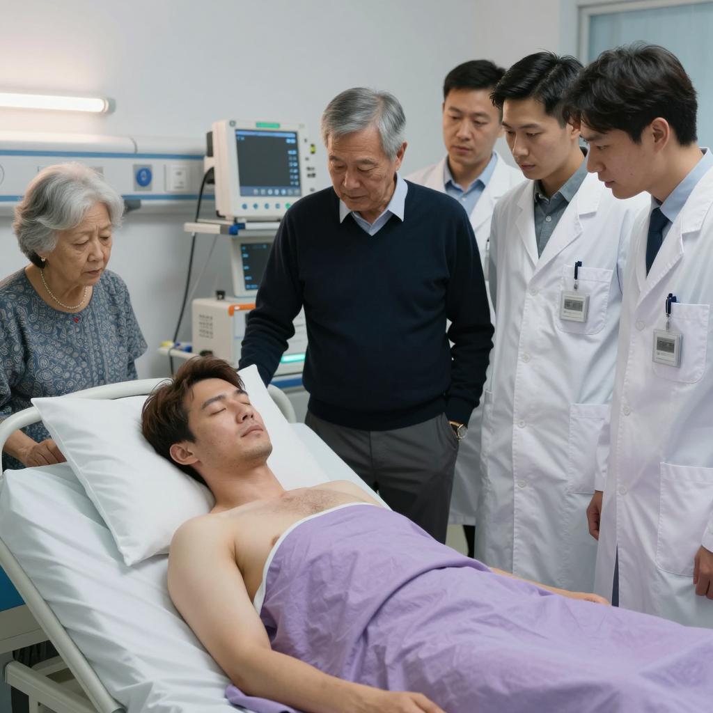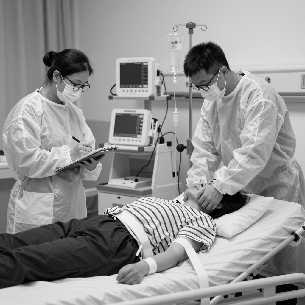 A chubby man in a white police uniform with a badge and patch, holding a small bottle, stands in a hospital room. Two patients lie on beds in the background. Green-tiled walls, door on the left, white blankets.