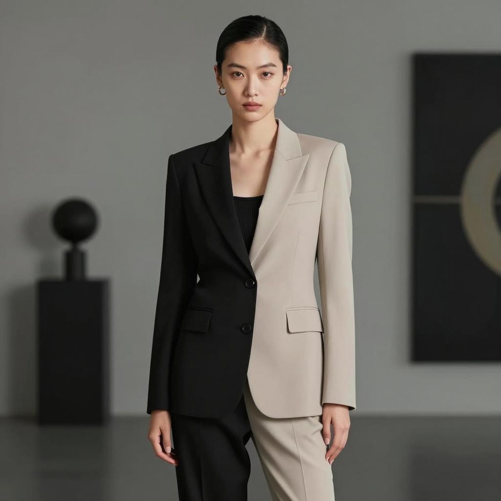 A sophisticated woman stands confidently in an elegant two-toned suit, exuding a modern and stylish vibe. Her poised posture and sleek hairstyle complement the contemporary setting, showcasing a blend of fashion and artistry.