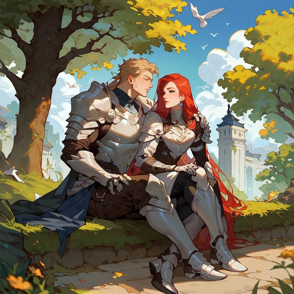 Man, siegmeyer_of_catarina, wearing armor, park, bird sitting on shoulder, zPDXL, score_9, score_8_up, score_7_up