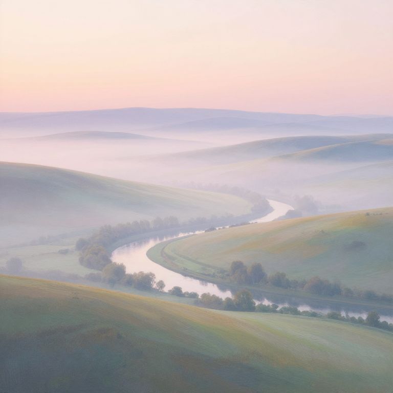 Moyenne landscape at sunrise, soft pastel colors blending across rolling hills, gentle fog hovering over the valley, a tranquil river winding through the scene, serene and peaceful mood, delicate brushstroke texture, impressionistic style.