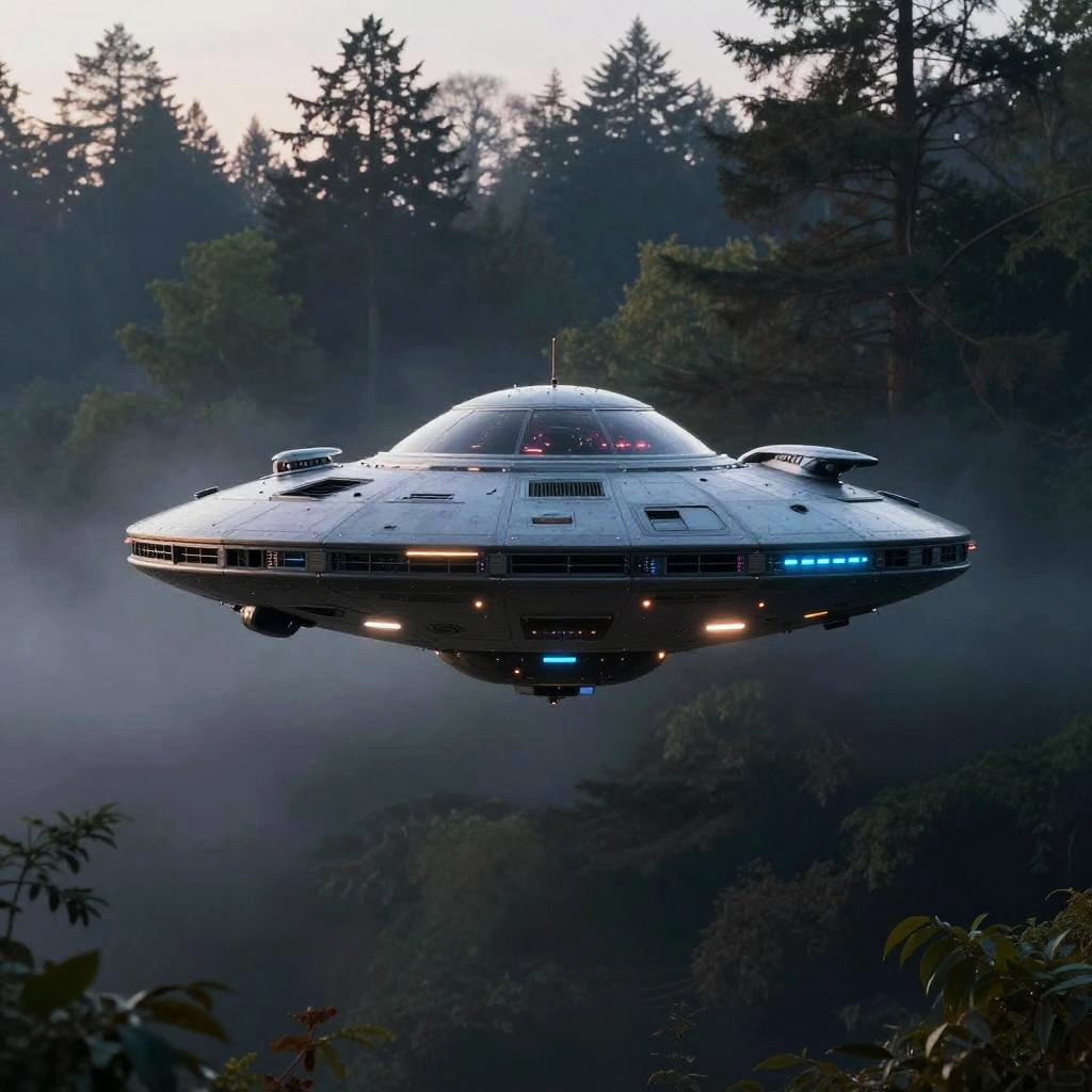 Photograph of a futuristic spaceship hovering above Machu Picchu, illuminating the ancient Inca city with beams of light, set against a backdrop of