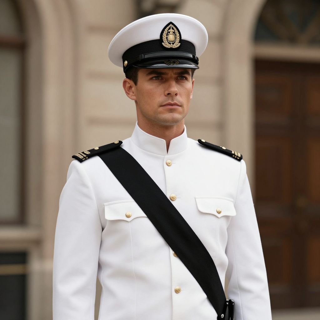 A handsome man wearing a pristine white uniform with a sleek black sash around his neck, a crisp white hat adorned with a bold logo on the brim, standing confidently in a classic, elegant setting. His posture is straight, eyes sharp and focused, exuding authority and professionalism. The lighting is soft and warm, highlighting the details of the uniform and the logo. Background features a historic building with a subtle vintage atmosphere. The scene is clean, detailed, and visually striking.