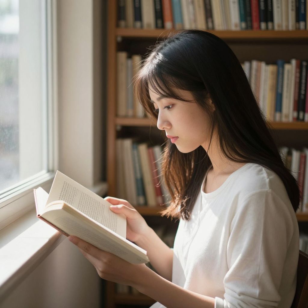 Photograph of an Asian woman with long black hair, wearing a cream-colored blouse, reading a book in a warmly lit library.