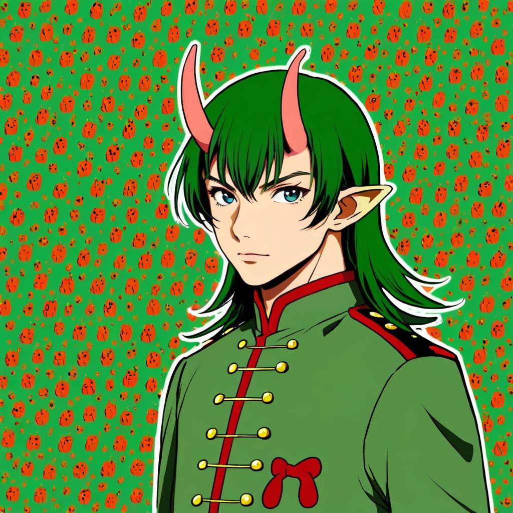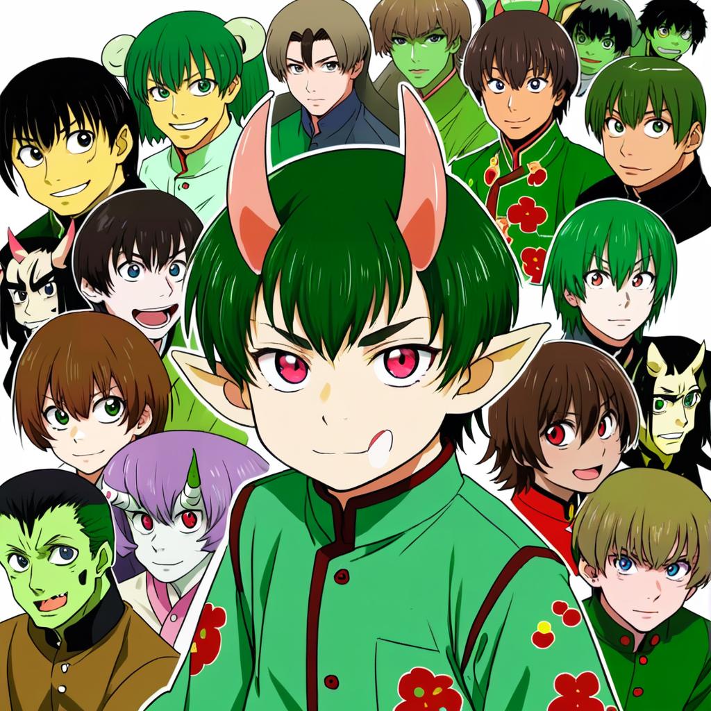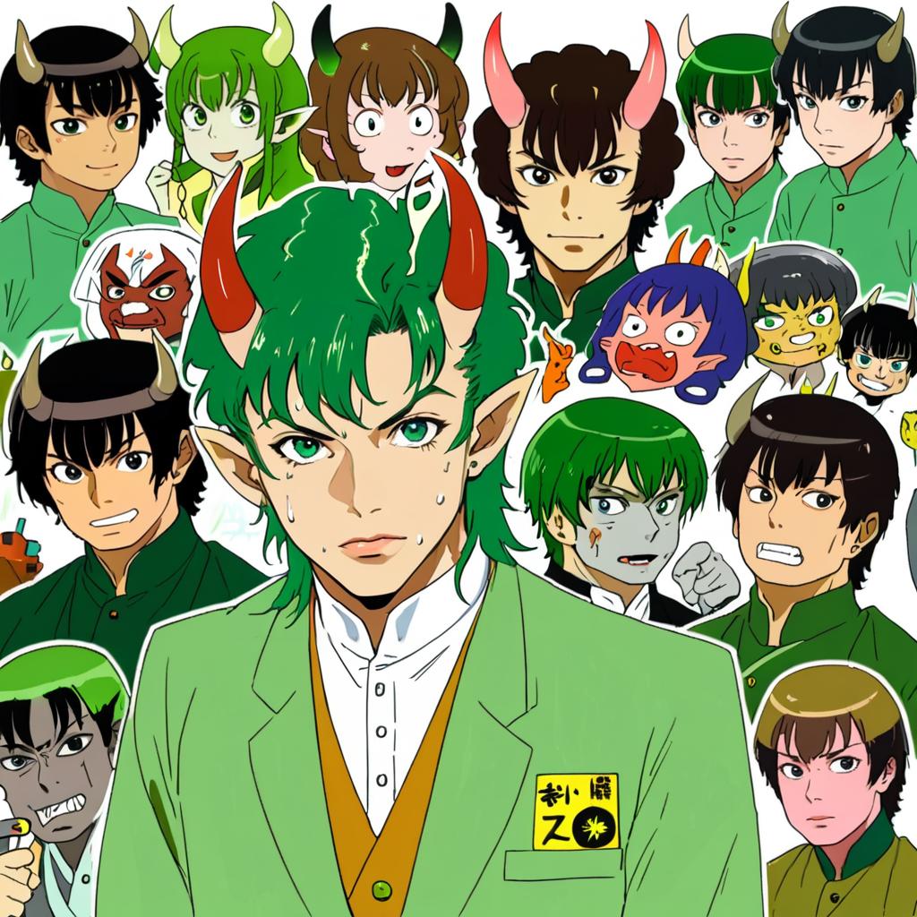 Moroboshi ataru, urusei yatsura, oni, oni horns, pointy ears, horns, long hair, green hair, brown hair, gakuran, by artist amai nekuta, anime