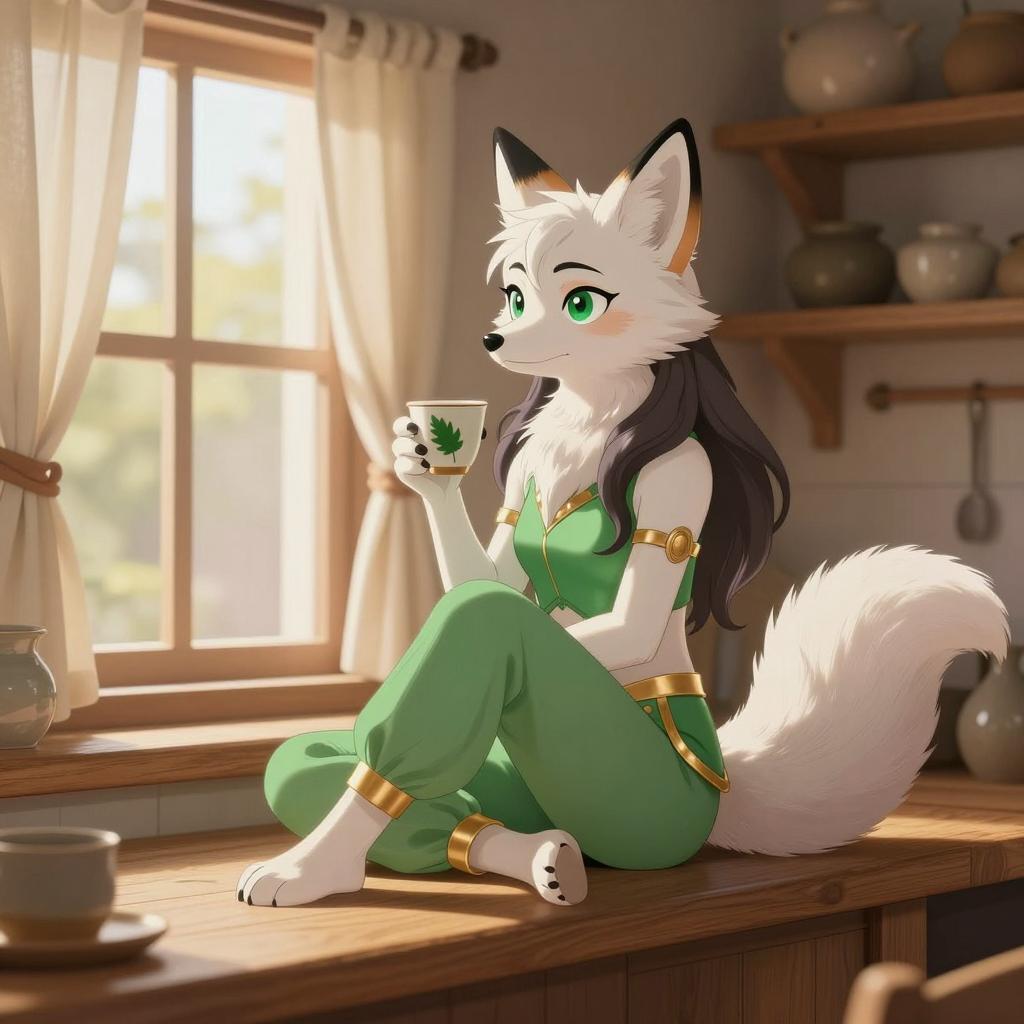 A cozy indoor scene with a female anthropomorphic white-furred fox character with long dark hair and green eyes, wearing a green sleeveless top and matching pants with gold accents, sitting on a wooden counter near a window with beige curtains, holding a small cup with a green leaf design, warm sunlight filtering through the window, wooden shelves with pottery in the background, soft warm lighting