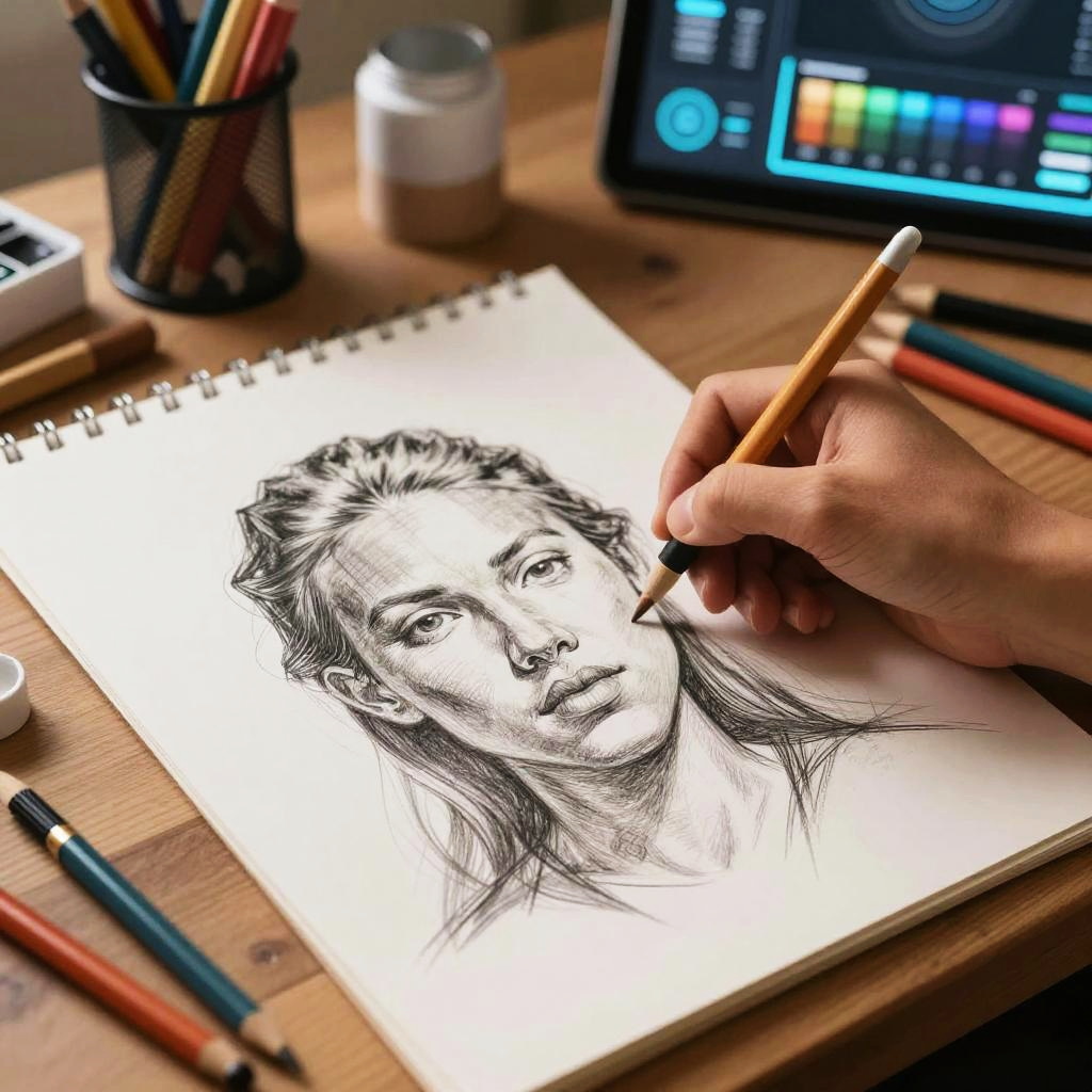 Drawing to picture AI transforming a rough pencil sketch into a vibrant, detailed digital painting, showcasing a creative artist's workspace filled with colorful art supplies and a futuristic AI interface glowing softly in the background, high resolution.