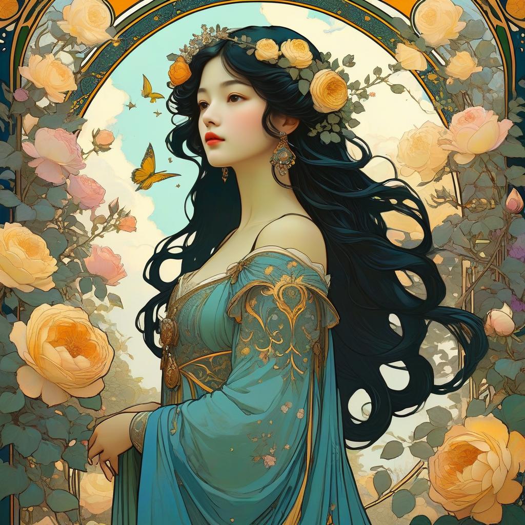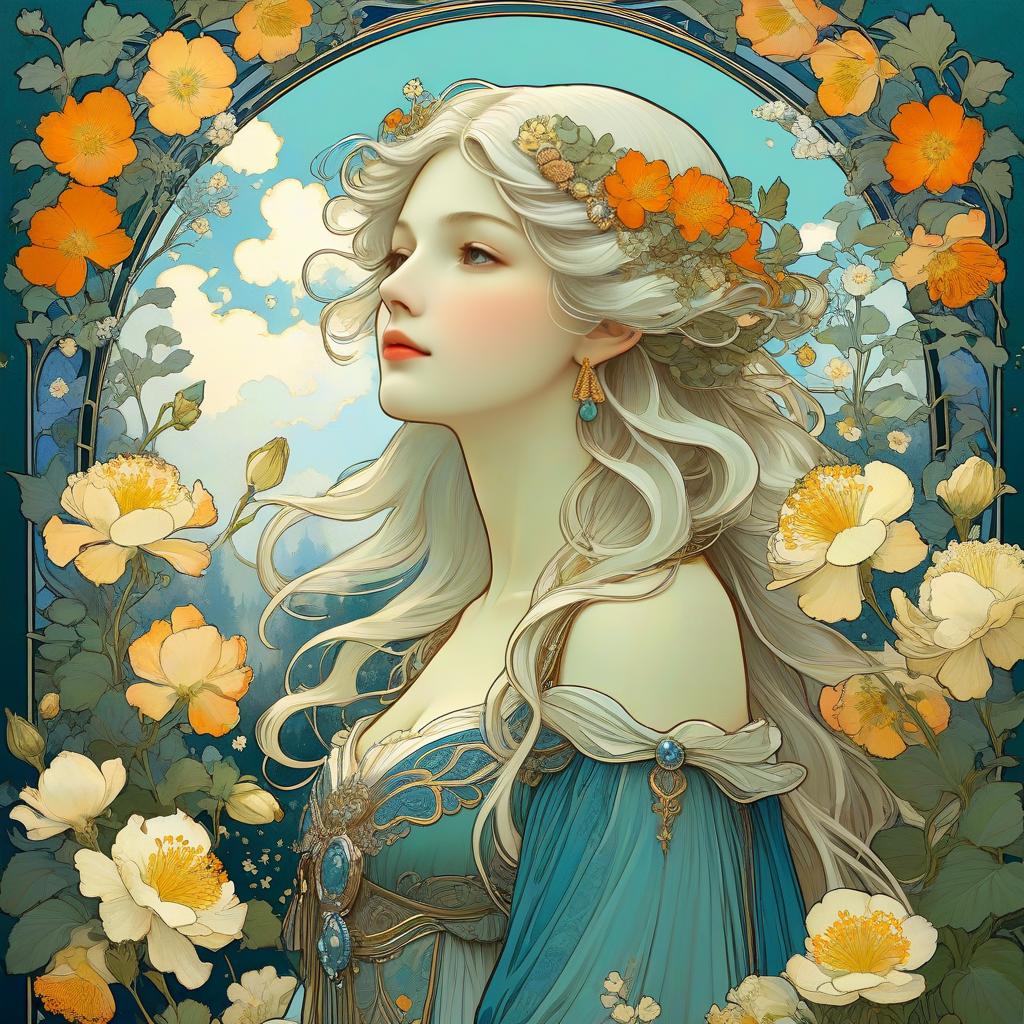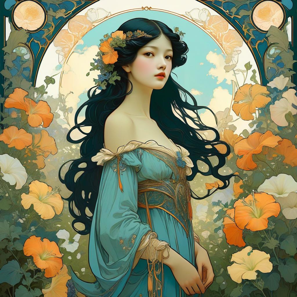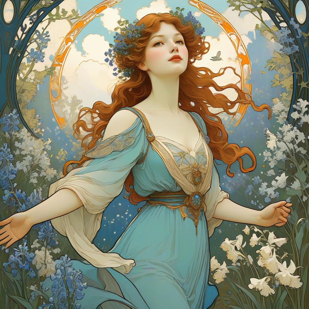 Art Nouveau style illustration of a graceful man with short black hair, wearing a blue robe adorned with intricate floral patterns, standing in a vibrant tulip garden. The scene includes a golden halo around his head, swallows flying in a serene sky, and a detailed botanical background with orange, yellow, and white tulips. The artwork is inspired by Alphonse Mucha, featuring thick lines and a harmonious nature-inspired color palette.