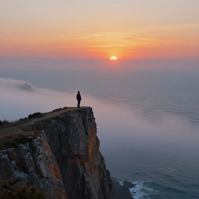 Envision an enchanting oil painting reminiscent of Hokusai's ethereal landscapes, depicting a solitary figure standing atop a jagged cliff, their gaze fixed upon the mesmerizing sunset that paints the sky in a tapestry of warm hues. As the horizon meets the boundless ocean below, a surreal mist shrouds the scene, blending the boundaries between reality and dreamscape. Capture this scene from an unconventional vantage point, showcasing a bird's-eye view that highlights the vast expanse of the sea as it extends towards the distant, luminous horizon—a gradient of emotion that embodies solitude and wonder in harmonious balance, inviting viewers to embark on an introspective voyage through the artist's imaginative realm.