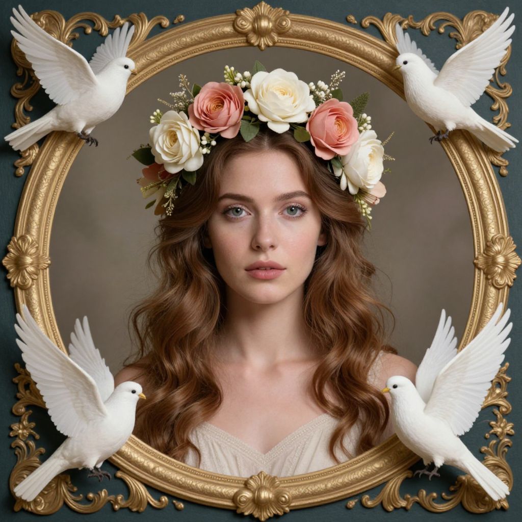 A woman adorned with floral headpiece and doves, framed by ornate designs, evoking a sense of heavenly virtue.