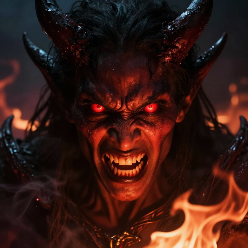 Close-up of dark evil red eyes blazing with fury, set against a backdrop of swirling black flames and smoke, evoking a powerful demonic presence in a fantasy realm
