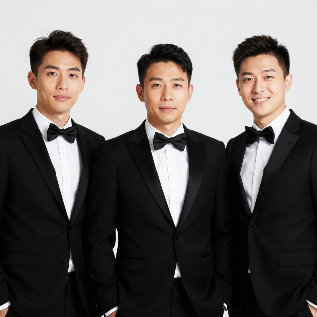 Three men in black tuxedos on a dimly lit stage. Center man smoking, smoke rising, intense gaze. Left man smiling, right man with black hat, serious expression. Background: dark brick wall. All men wearing bow ties, white shirts. Center man's right hand holding cigarette. Right man's hand in pocket. Left man's hand relaxed.