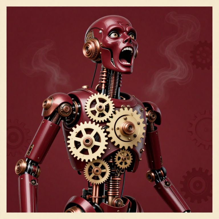A digital illustration of a maroon, humanoid robot with a shocked expression, mouth open wide. The robot has metallic gears and cogs on its chest and arms, with visible joints and wires. The background is a gradient of dark red to maroon with subtle, large gear patterns. The robot's shiny, red plastic exterior contrasts with the metallic gears, creating a steampunk aesthetic. The image has a white border and a dramatic, intense atmosphere.